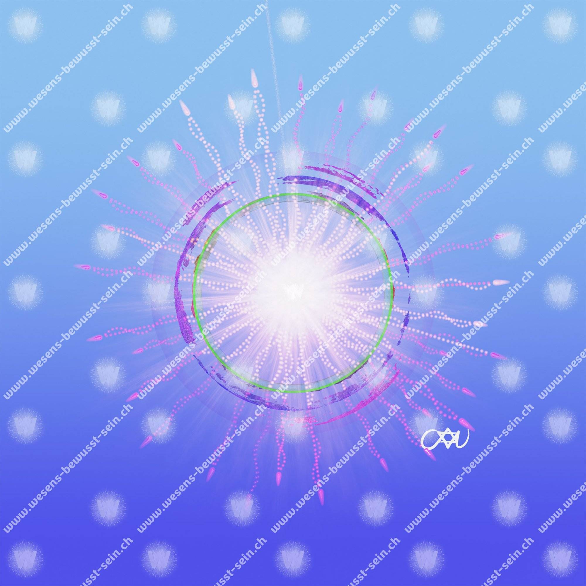 Scheiben-Querschnitt durch den entschleierten Menschen: Der Körper ist als grüne Kugel dargestellt, mit den körperlichen Überlebensstrategien – farbige Landteile – und seinen Identifikationsschichten von Scham und Schuld – blaue, violette bis magentafarbene Wolken