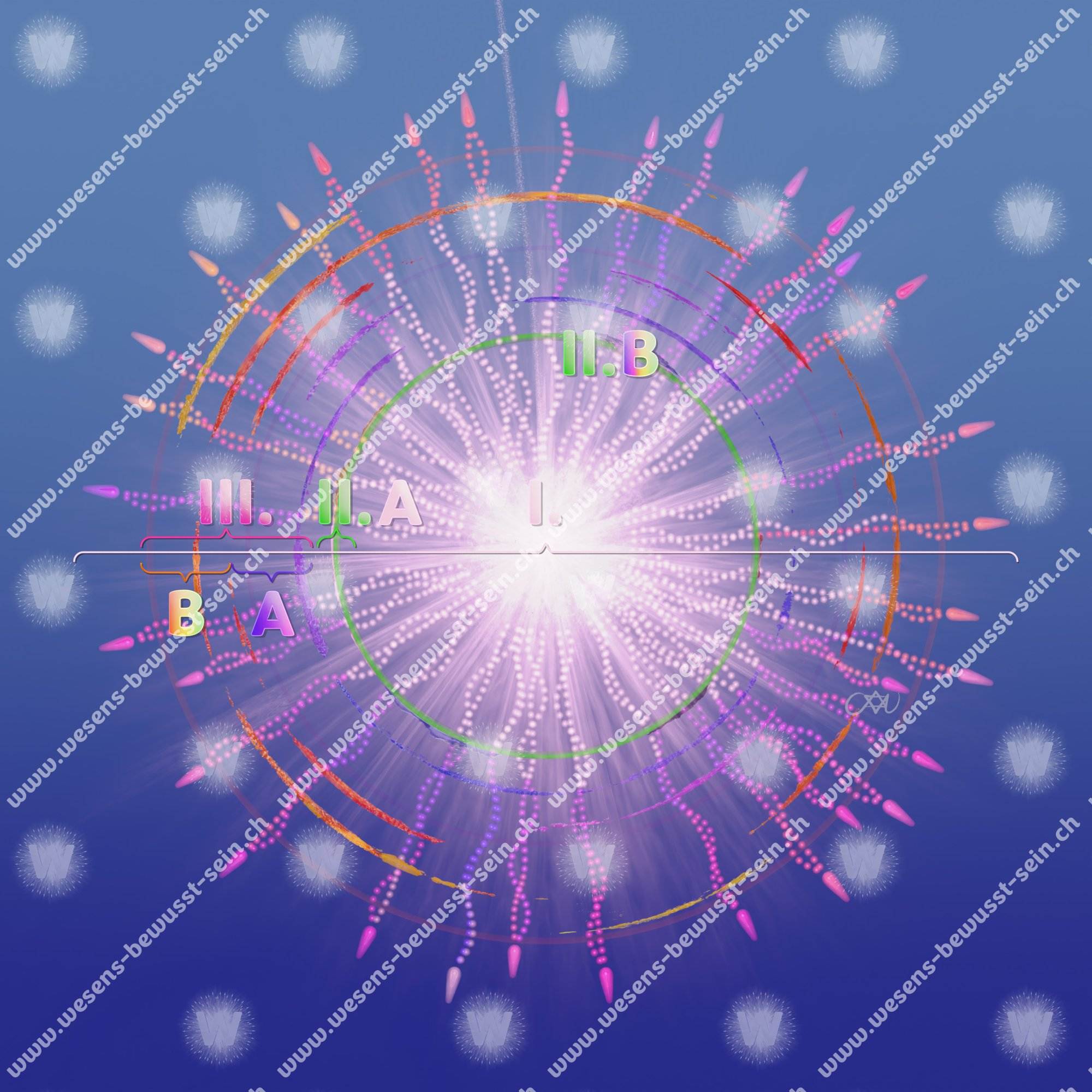 Die Abbildung 3.14 ist eine Zusammenfassung aller wesensverdeckenden Schichten und der einen wesensunterstützenden Schicht, die als eine Querschnittscheibe zu sehen ist und durch den entschleierten Menschen verläuft, benannt mit den römischen Ziffern I bis III und ihren jeweiligen Unterteilungen A und B.